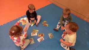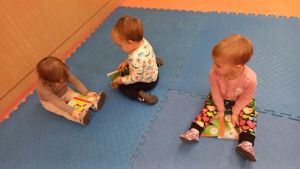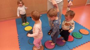 Tudi najmlajši se zelo radi igrajo s čutno potjo, katere se poslužimo večkrat tedensko. Najprej pomagajo pri prenašanju le-te, nato se sami sezujejo in že sledi hoja in tek po čutni poti. Več fotografij si lahko pogledate TUKAJ.