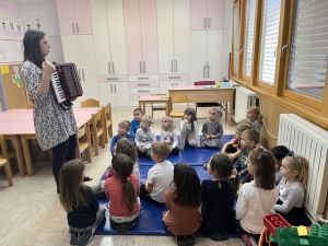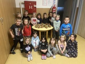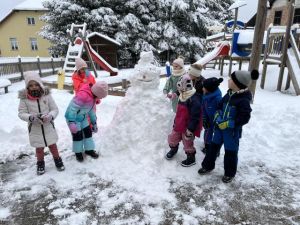 V petek, 22. novembra 2024, nas je obdaril prvi sneg. Otroci so se ga zelo razveselili. Zimsko obarvani dopoldan smo med drugimi dejavnostmi zapolnili z igro na snegu. Oblečeni v topla oblačila smo se najprej sprehodili po snegu do igrišča in nazaj. Otrokom je bila hoja po snegu zelo zanimiva, saj so opazovali in iskali svoje stopinje, zasnežena drevesa, klopi ter ptičke, ki so letale okrog ptičje hiške. Po prihodu nazaj do vrtca smo naredili velikega snežaka. Da je bil še lepši smo mu dodali še oči, nos, usta in postavili lonec na glavo. Zapeli smo mu pesem, Sneženi mož. Preživeli smo...