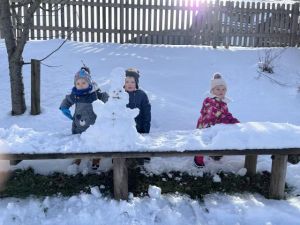 V sredo, 24. 01. 2024, smo se z najmlajšimi v lepem, zimskem dopoldnevu odpravili na sneg. Otroci so sneg opazovali, ga tipali, raziskovali, po njem hodili, opazovali sledi, se dričali in iz snega izdelali sneženega moža, ob katerem smo se fotografirali in prepevali pesmice o zimi in snežaku. Otroci so v igri s snegom zelo uživali, predvsem pa gradili prijetno druženje ob skupnem ustvarjanju in vzpostavljanju socialnih stikov z vrstniki. Fotografije si lahko ogledate tukaj.